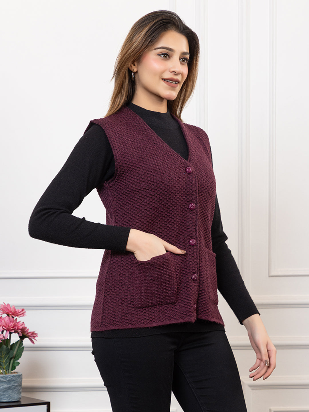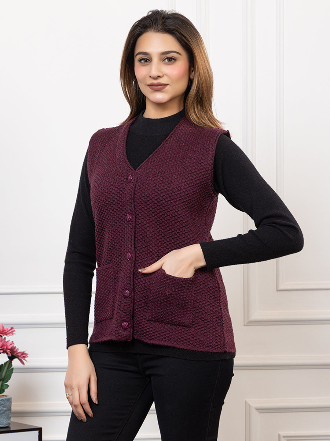 1221 Wine Self Design Sleeveless V Neck Acrylic Wool Warm Front Two Pockets Cardigan TWENTY ME