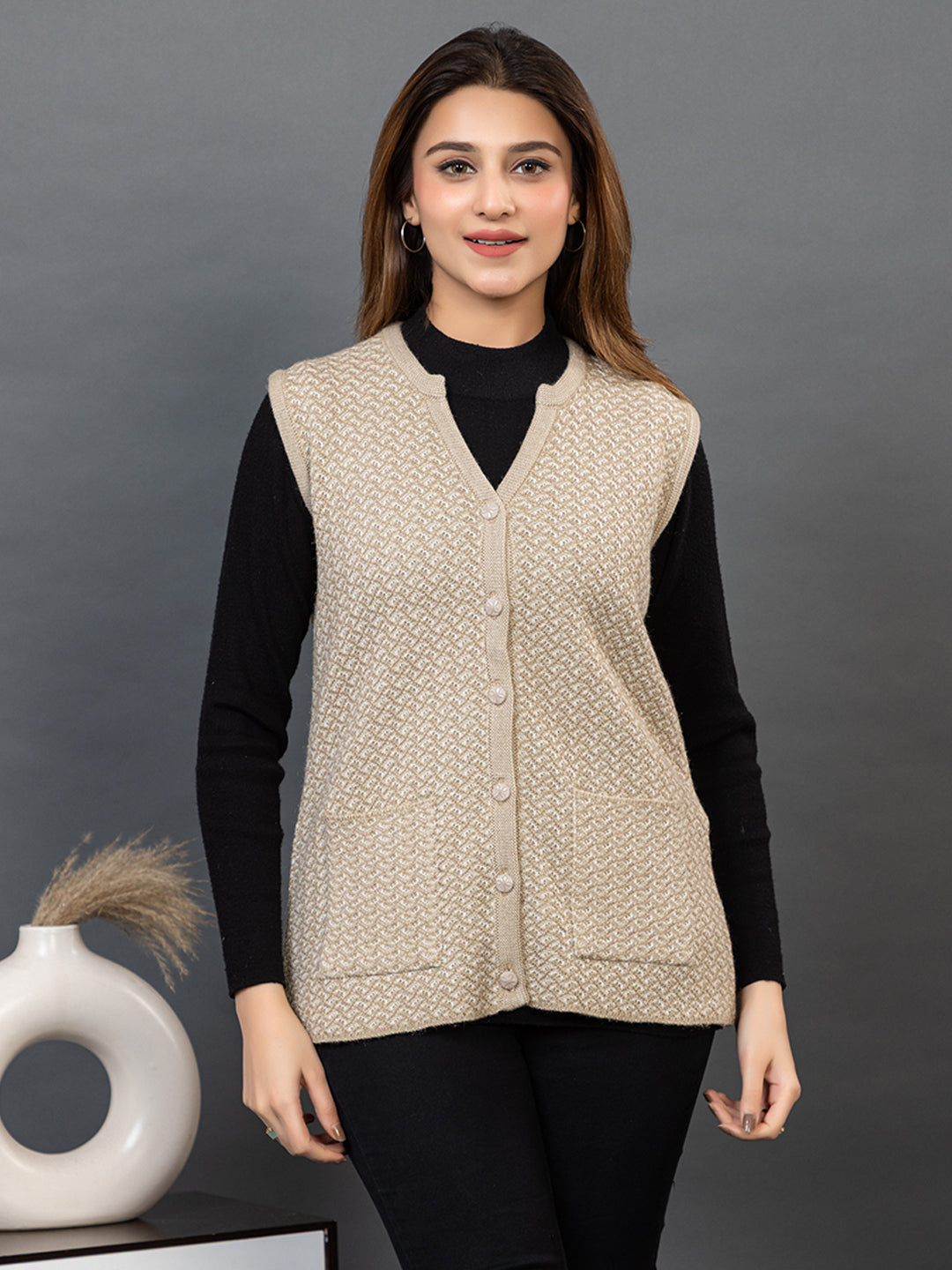 1239 Beige Self Design Sleeveless V Neck Acrylic Wool Warm Front Two Pockets Cardigan TWENTY ME