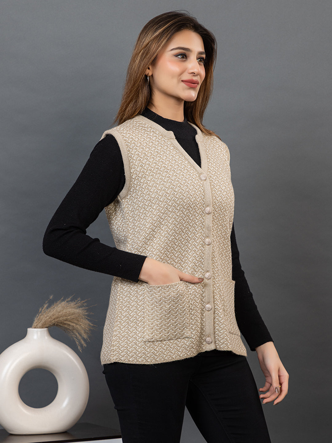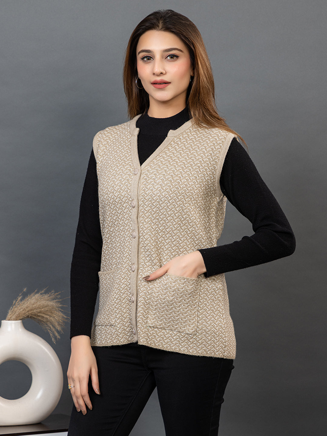 1239 Beige Self Design Sleeveless V Neck Acrylic Wool Warm  Front Two Pockets Cardigan TWENTY ME