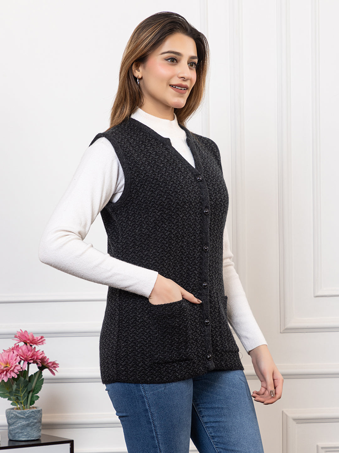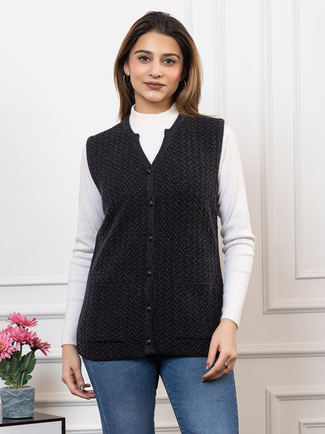1239 Black Self Design Sleeveless V Neck Acrylic Wool Warm Front Two Pockets Cardigan TWENTY ME