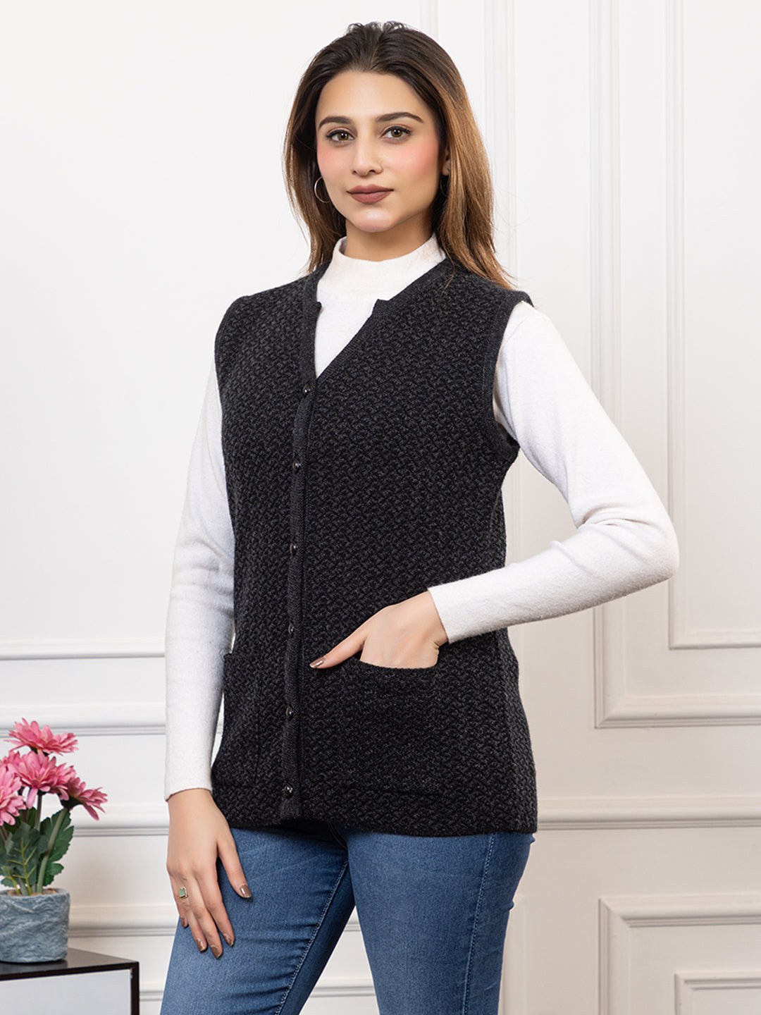1239 Black Self Design Sleeveless V Neck Acrylic Wool Warm  Front Two Pockets Cardigan TWENTY ME