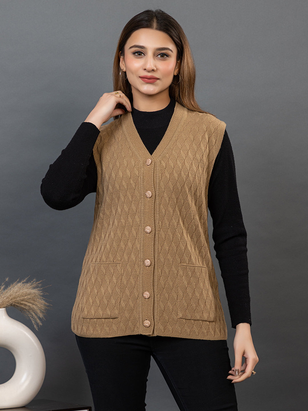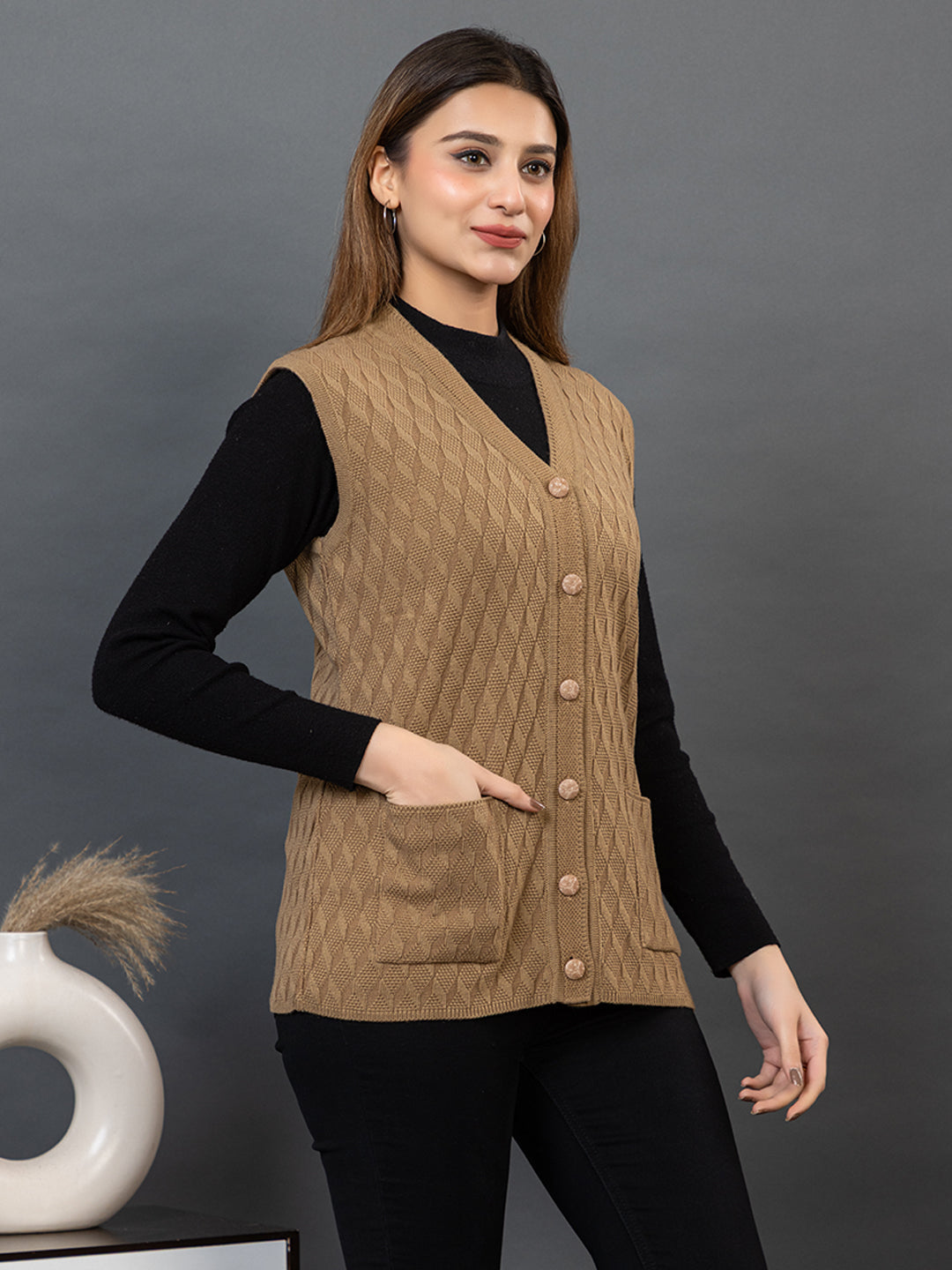 1266 Camel Self Design Sleeveless V Neck Acrylic Wool Warm Front Two Pockets Cardigan TWENTY ME