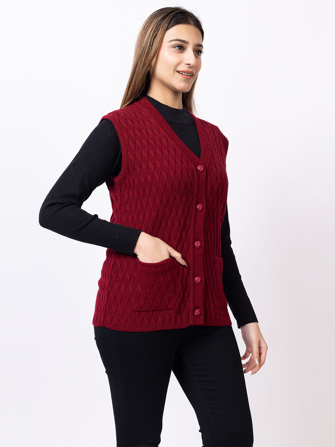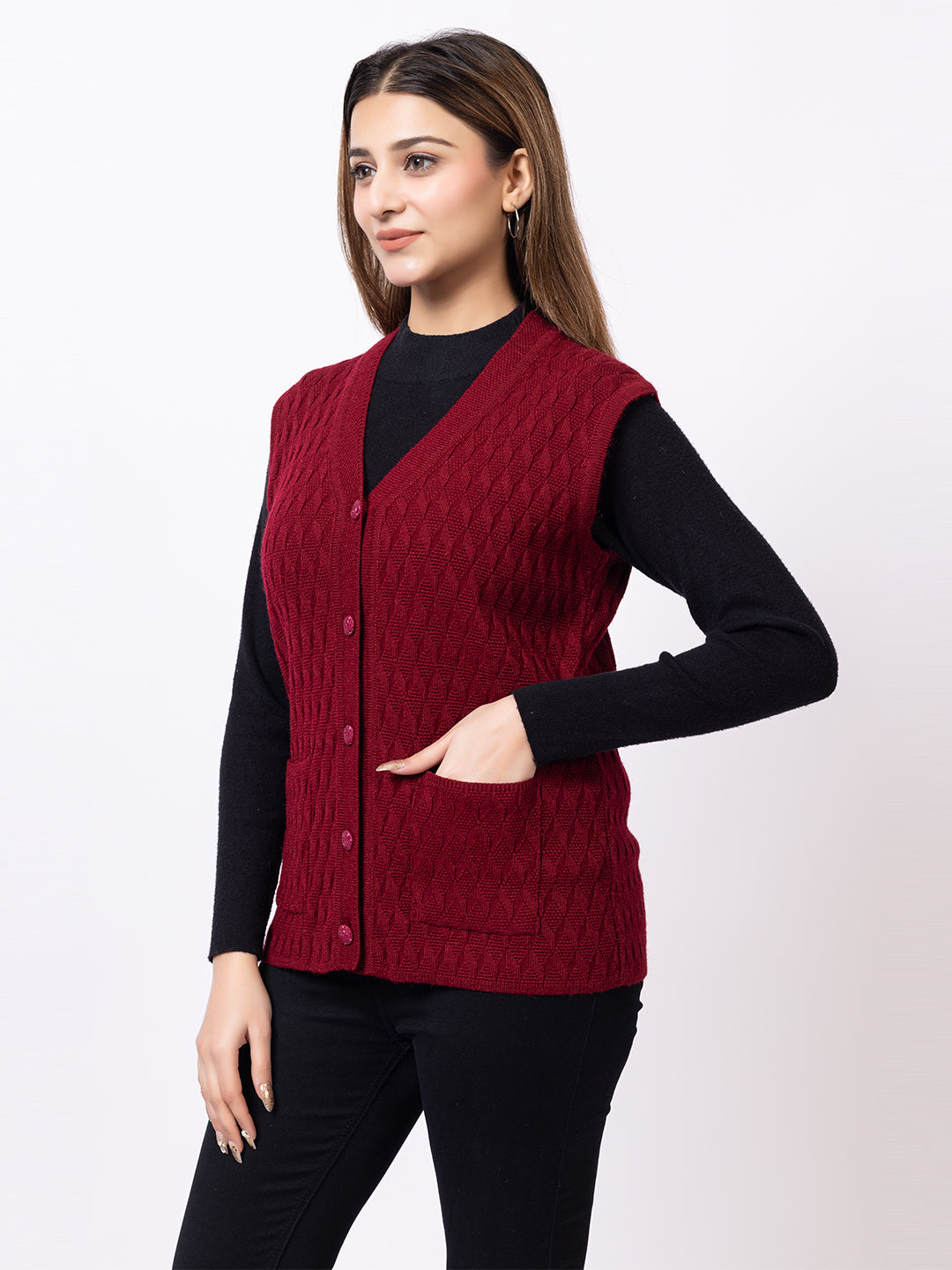 1266 Maroon Self Design Sleeveless V Neck Acrylic Wool Warm Front Two Pockets Cardigan TWENTY ME