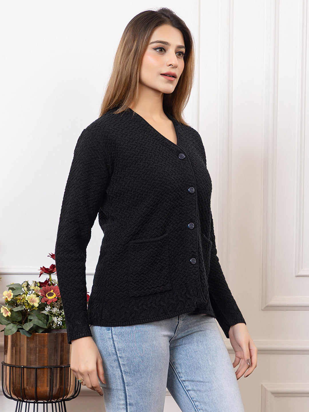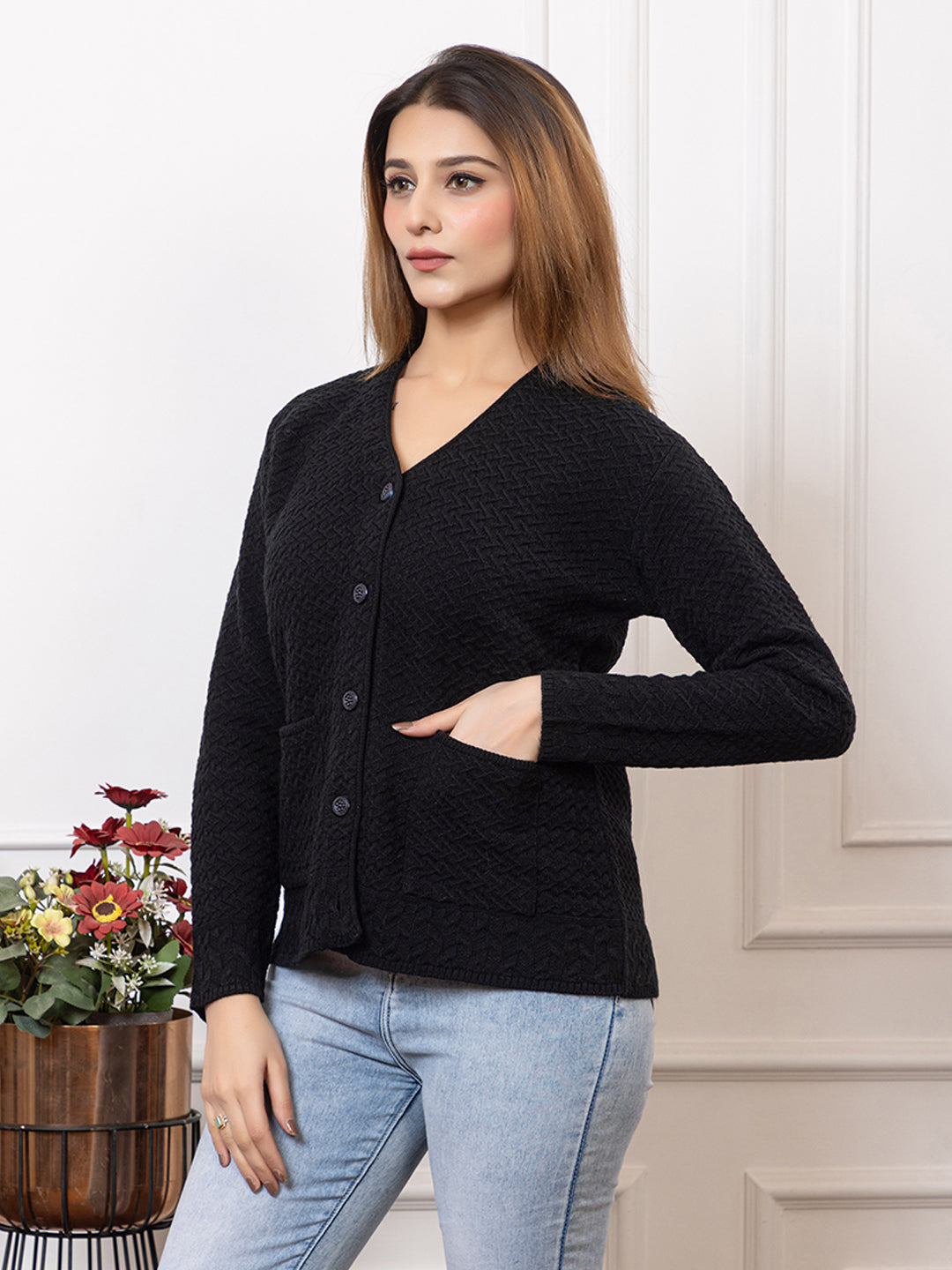 2032 Black Self Design V Neck Acrylic Wool Cardigan With Front Two Pockets TWENTY ME