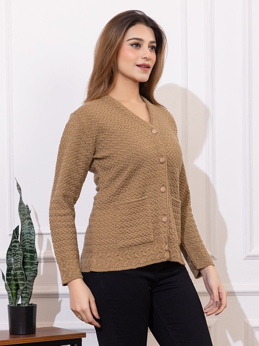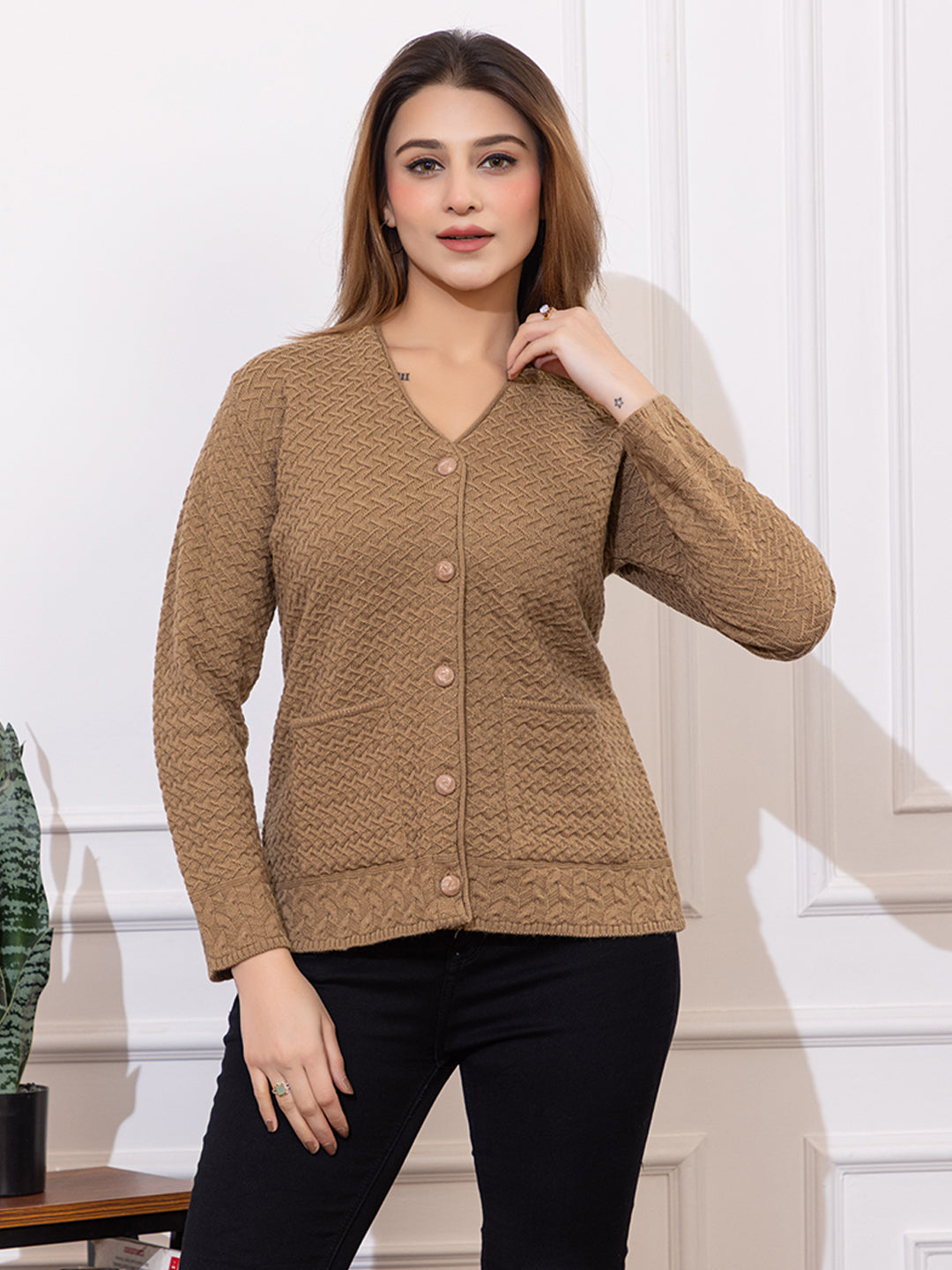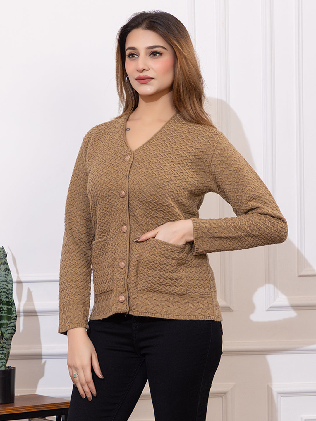 2032 Camel Self Design V Neck Acrylic Wool Cardigan With Front Two Pockets TWENTY ME