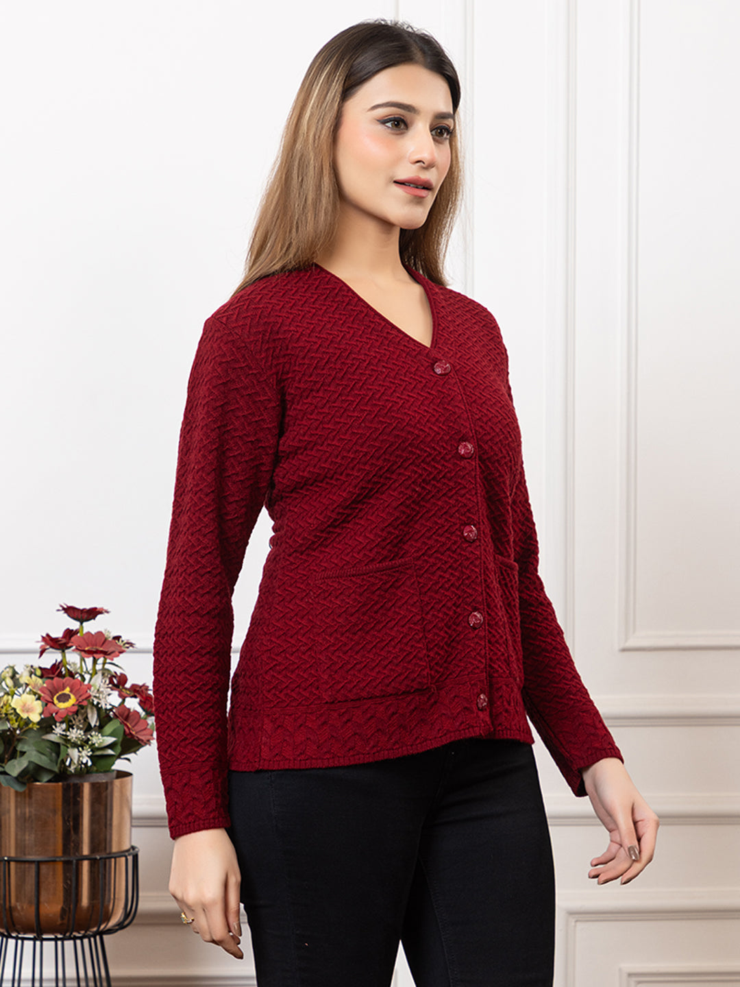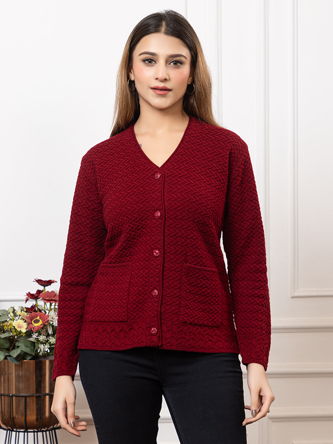 2032 Maroon Self Design V Neck Acrylic Wool Cardigan With Front Two Pockets TWENTY ME