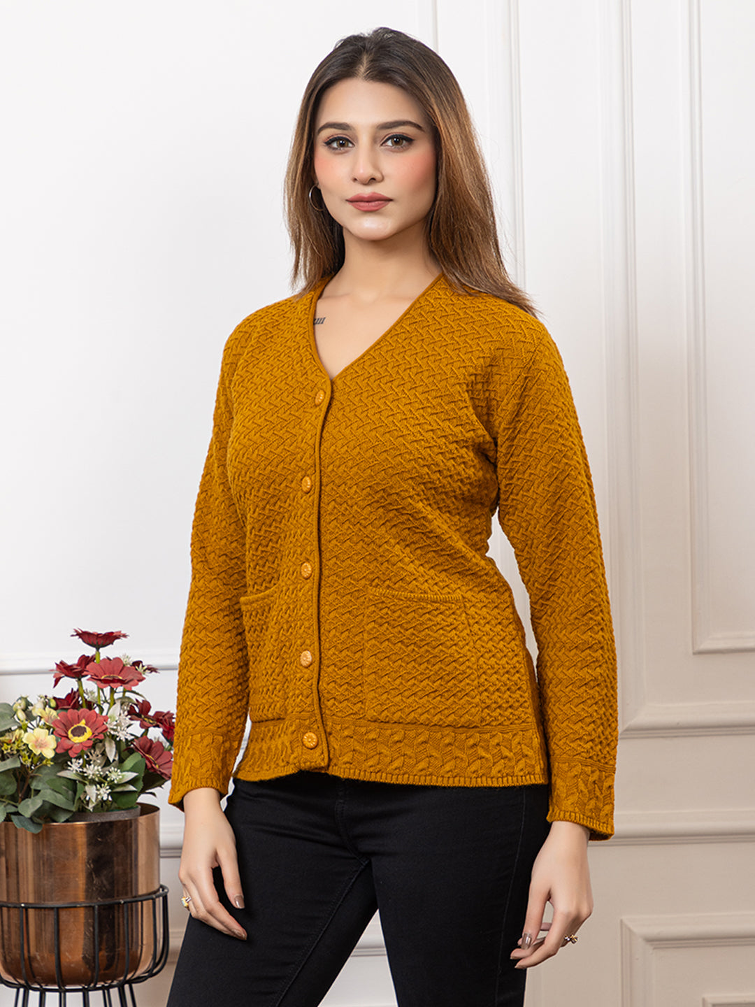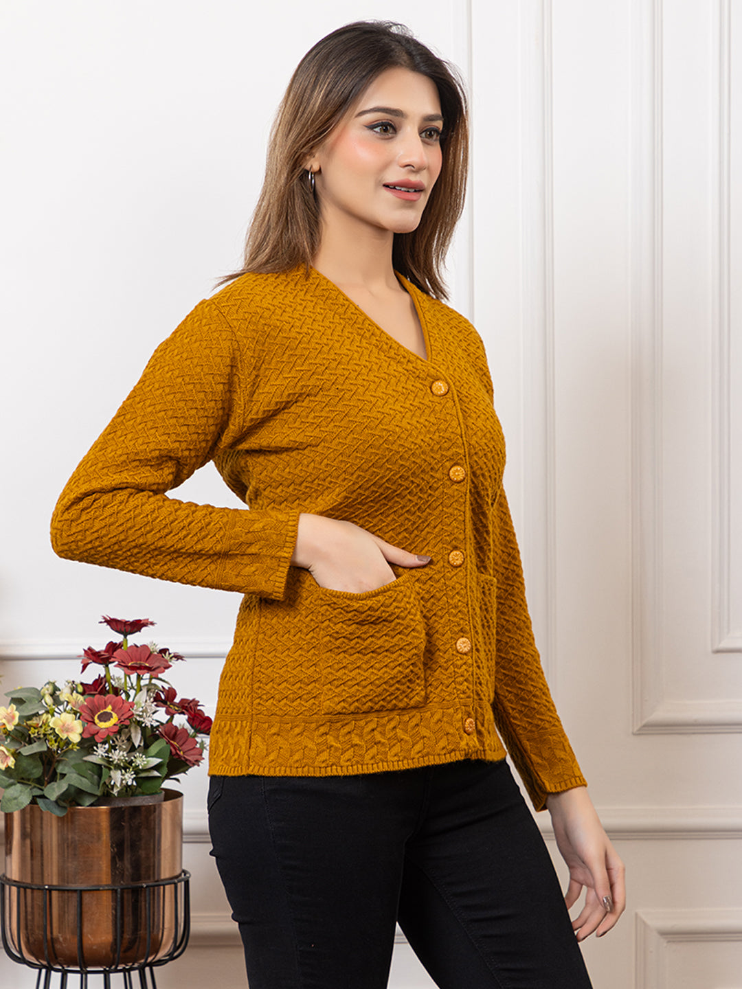 2032 Mustard Self Design V Neck Acrylic Wool Cardigan With Front Two Pockets TWENTY ME