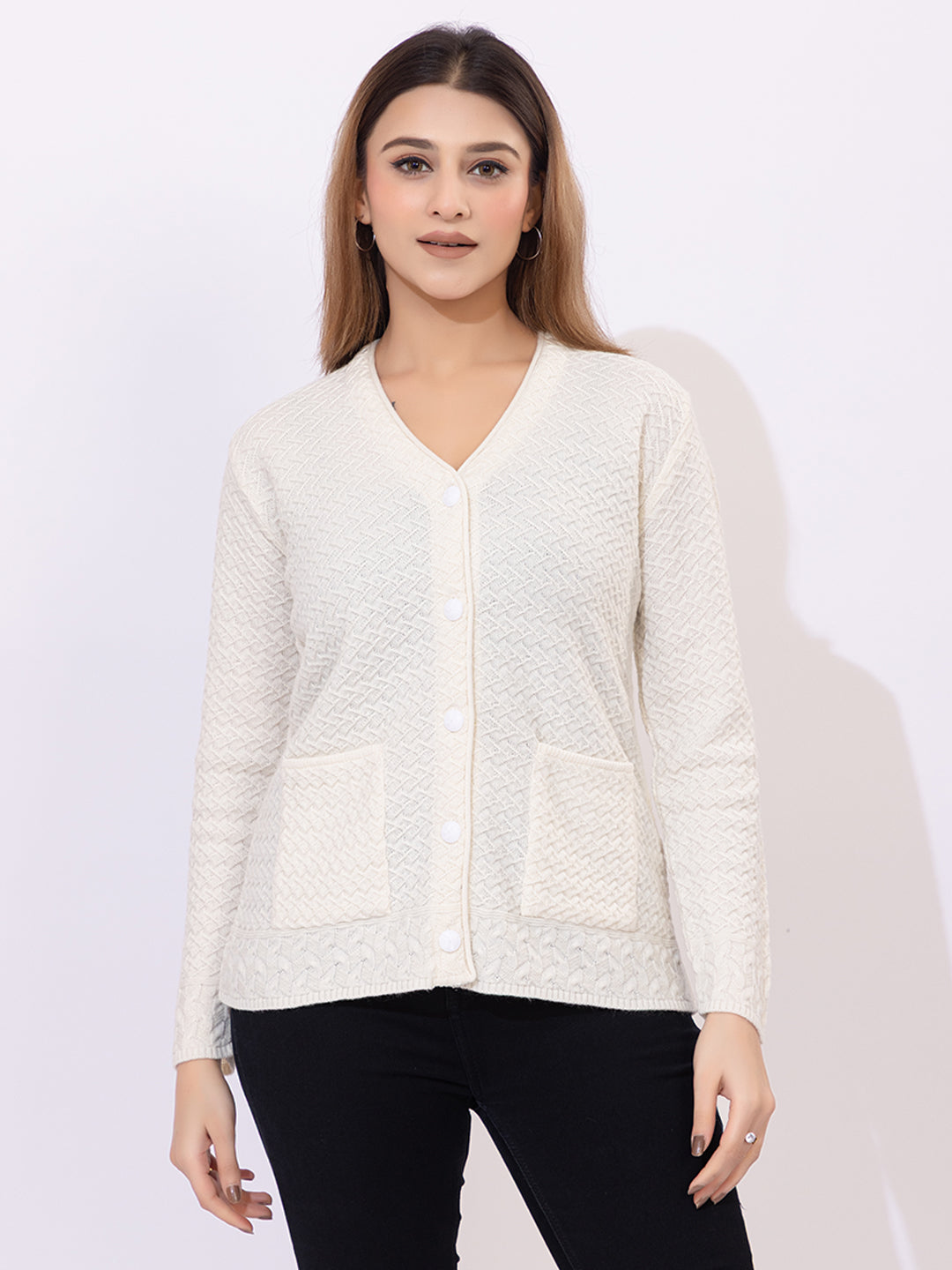 2032 White Self Design V Neck Acrylic Wool Cardigan With Front Two Pockets TWENTY ME