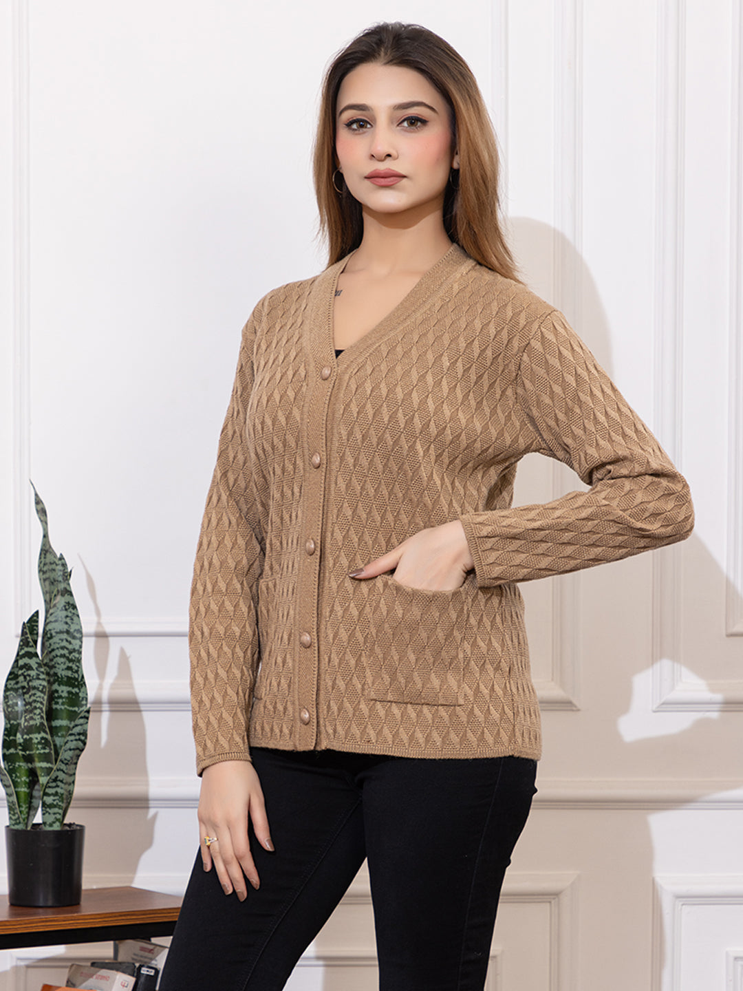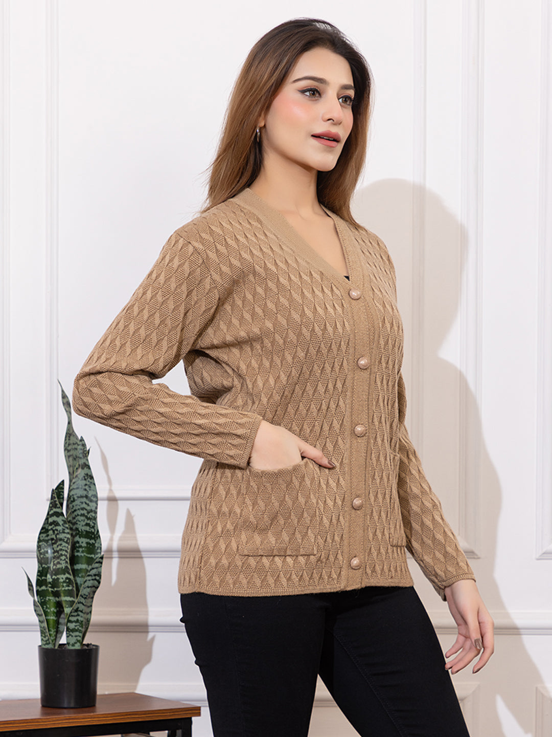 2344 Camel Self Design V Neck Acrylic Wool Cardigan With Front Two Pockets TWENTY ME