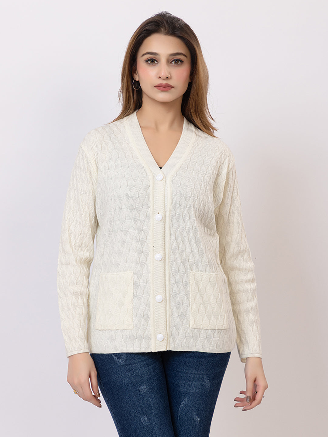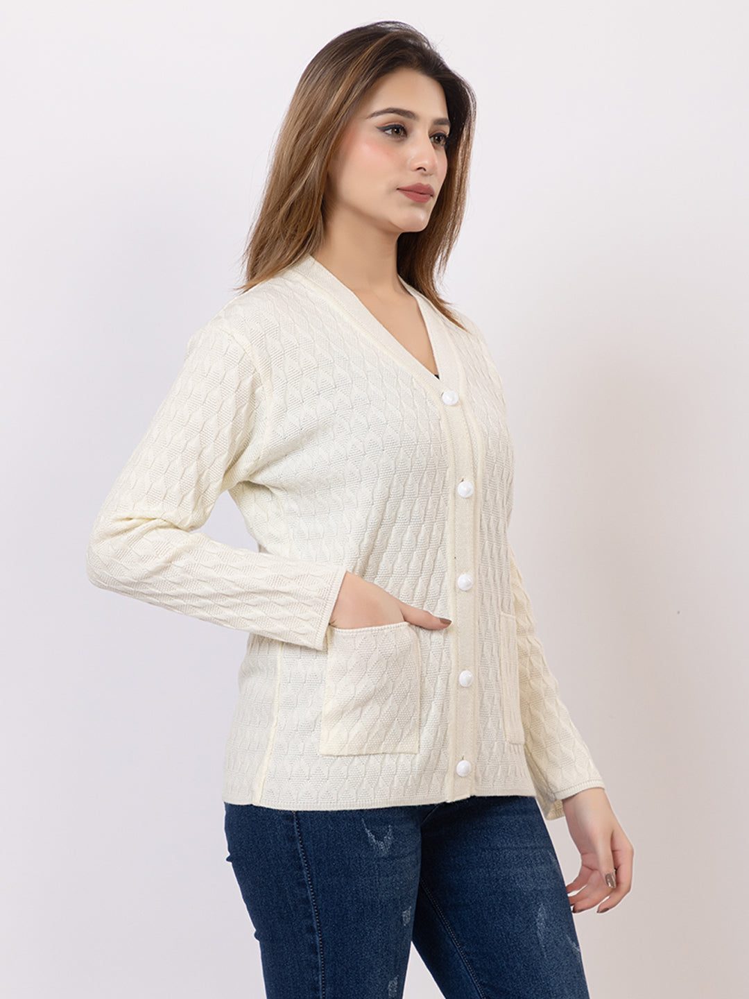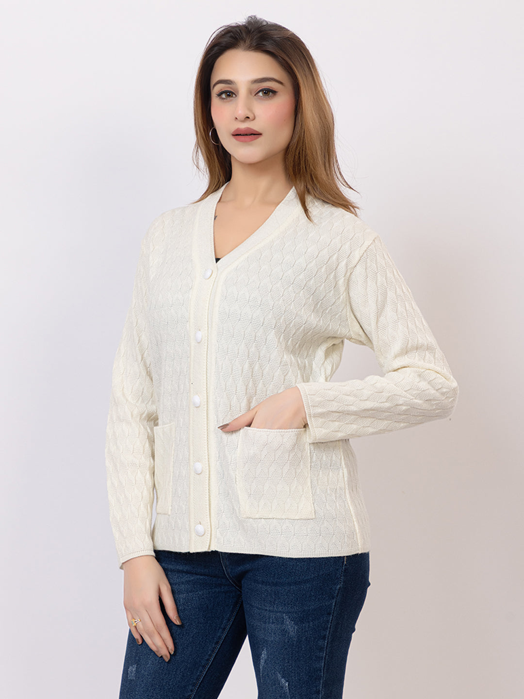 2344 White Self Design V Neck Acrylic Wool Cardigan With Front Two Pockets TWENTY ME