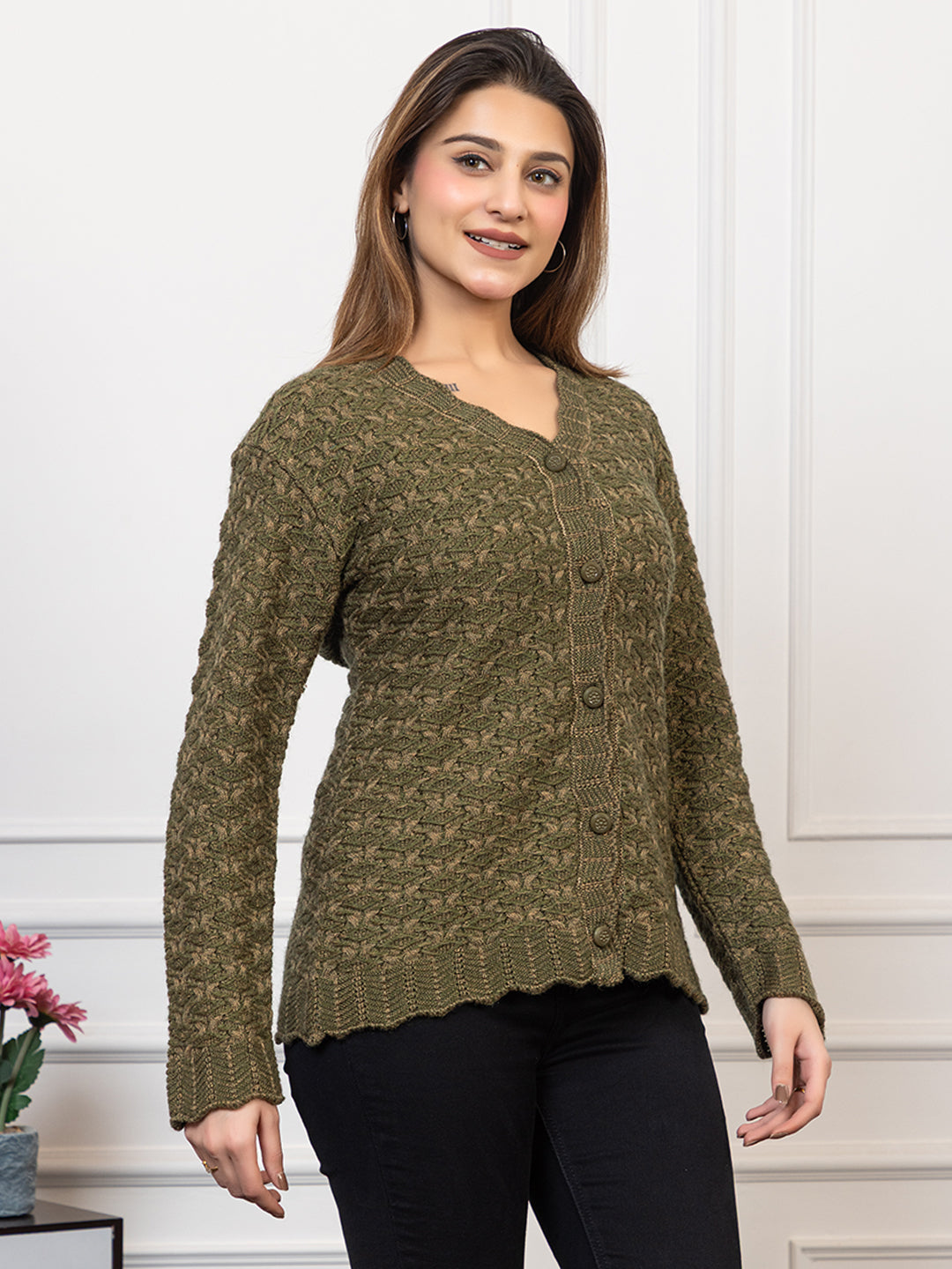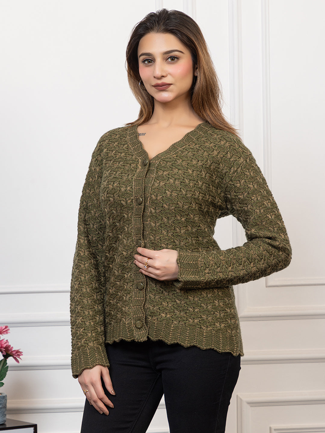 2383 Green Self Design Full Sleeves V Neck Acrylic Wool Warm Cardigan for Women TWENTY ME