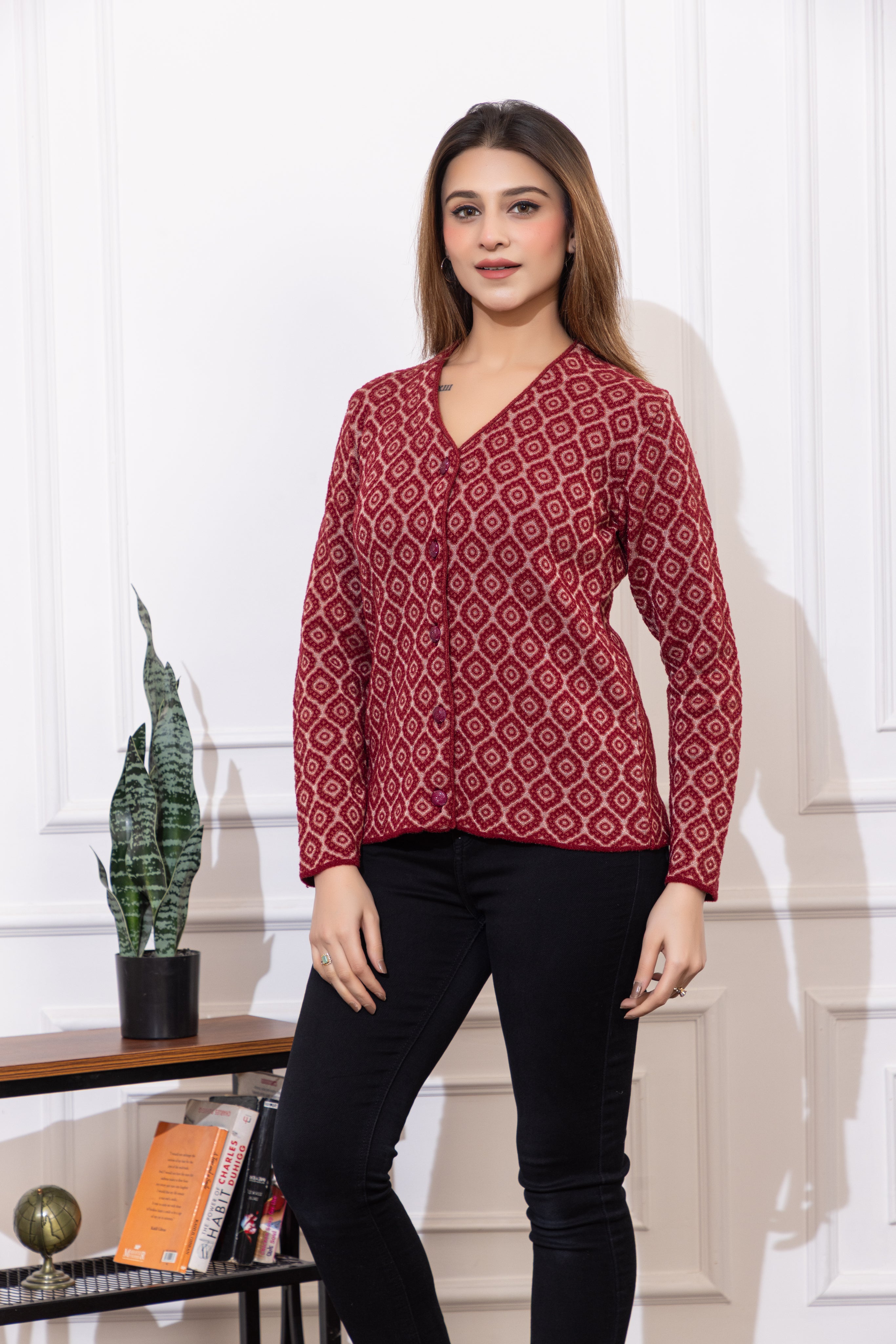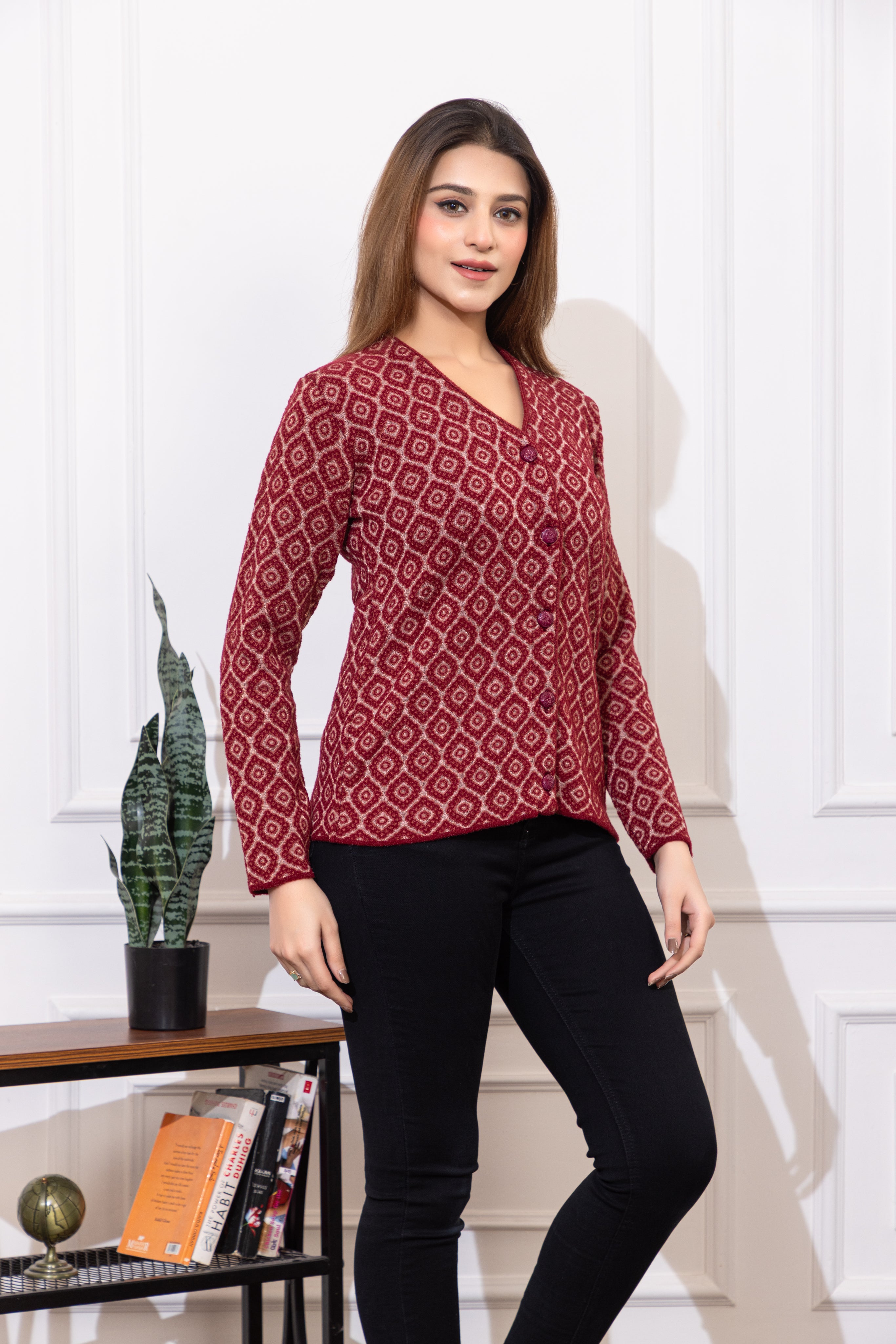 2884 Maroon Acrylic Blend V Neck Full Sleeve Women's Cardigans Winter Wear TWENTY ME
